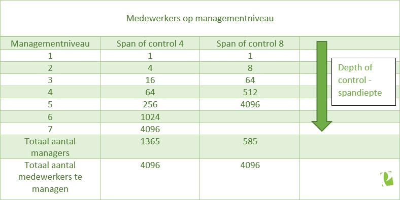 Op bovenstaande tabel zien we namelijk dat bij een span of control van 8 een bedrijf 780 managers minder nodig heeft om 4096 medewerkers te managen t.o.v. van een span of control van 4. Bij een span of control van 8 zijn er bijgevolg 2 managementniveaus minder.